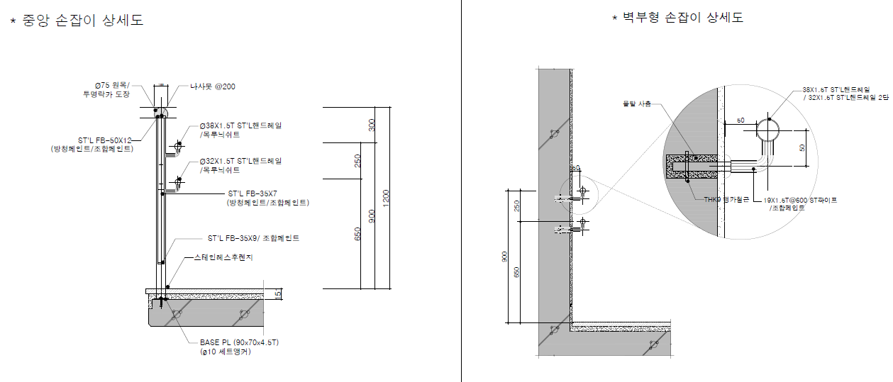 2. 양측 손잡이 설치 (두께38, 벽에서 이격 50, 시종점 수평구간 300, 참 수평구간 150~300, 높이 800~900)