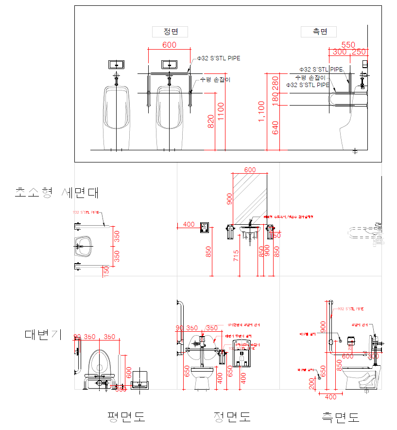 장애인화장실 내부 세면대 및 대변기 상세도는 아래 첨부했습니다