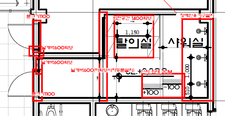 그리고 일반화장실에 경우 세면대 전면 1.4m 회전공간 미확보와 도어 사이즈 1.1m 미확보 및 손잡이 측면 활동공간(날개벽) 0.6m 미확보 되어 체크했습니다.