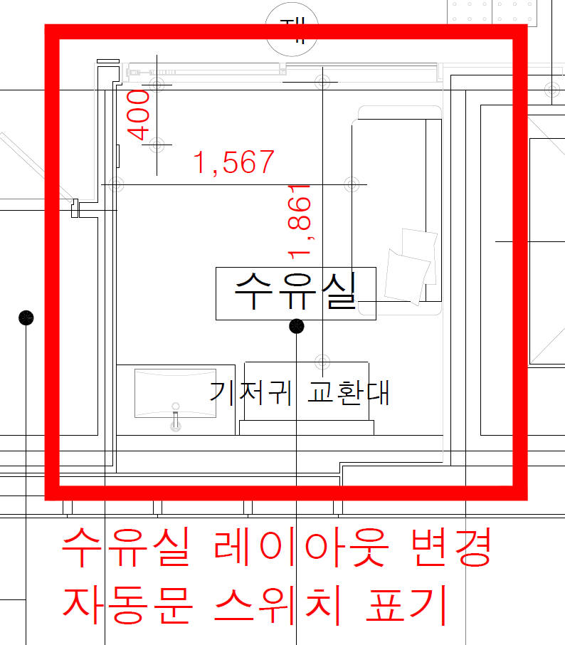 보통 수유실 레이아웃을 고려할때 세면대 측면에 기저귀 교환대를 설치하는 것이 사용상 편리하기 때문에