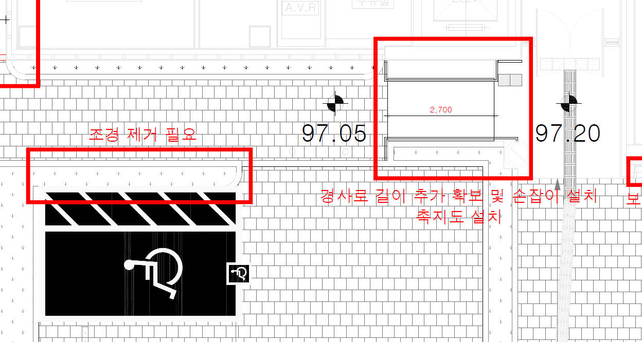 차도로 내려가야하는 동선이기 때문에 조경 삭제를 표기하였습니다.
