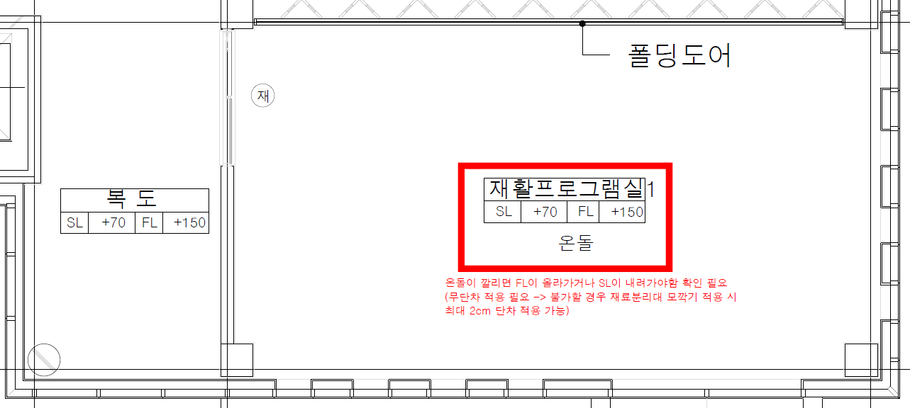 온돌방이나 난방이 들어가는 실만 구조 레벨(SL)을 낮춰서 바닥 레벨(FL)을 맞춥니다.
