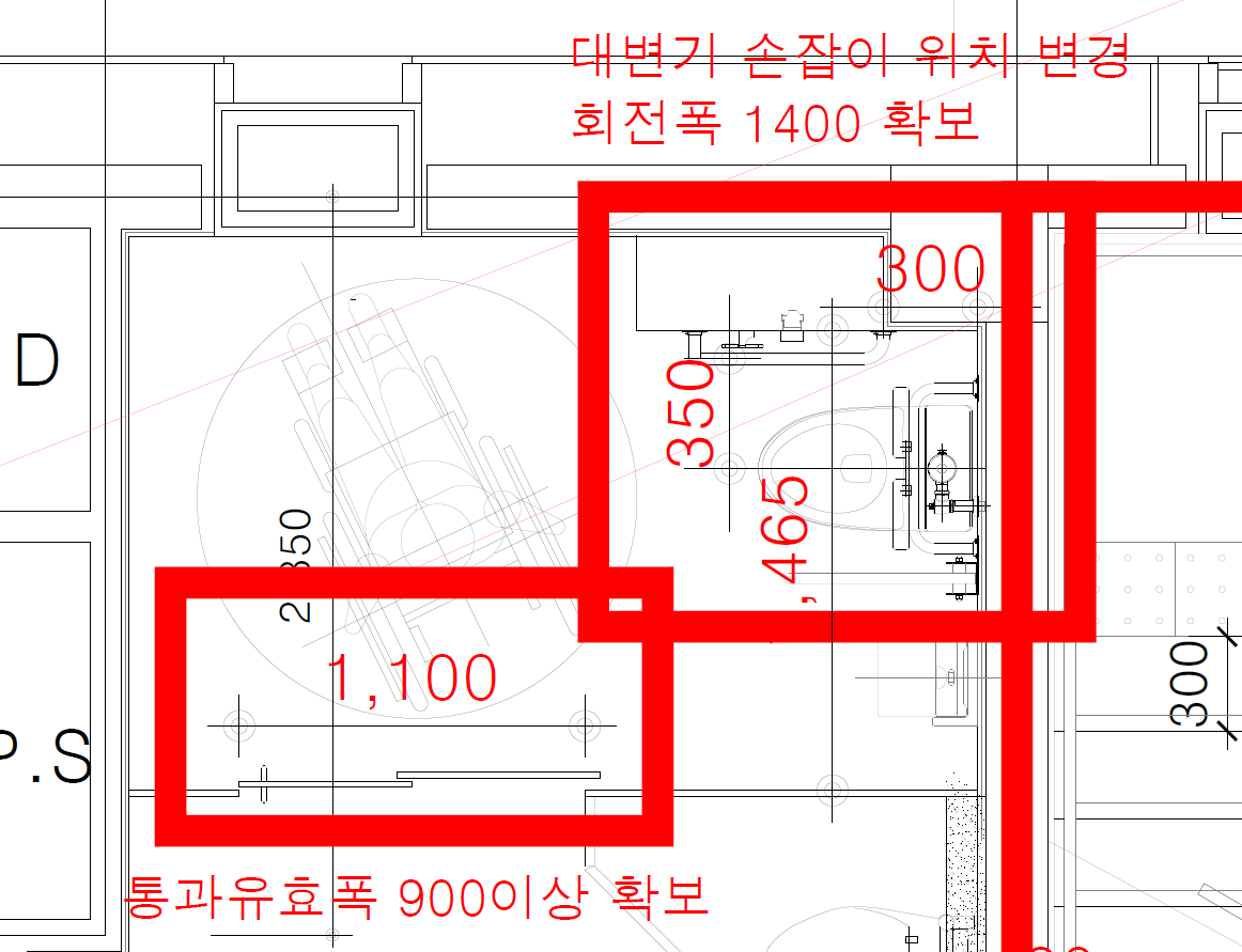또한 복도 손잡이도 설치해야 하니 타이트하게 복도 유효폭을 계획 시에는 구조가 변경될 수 있습니다.