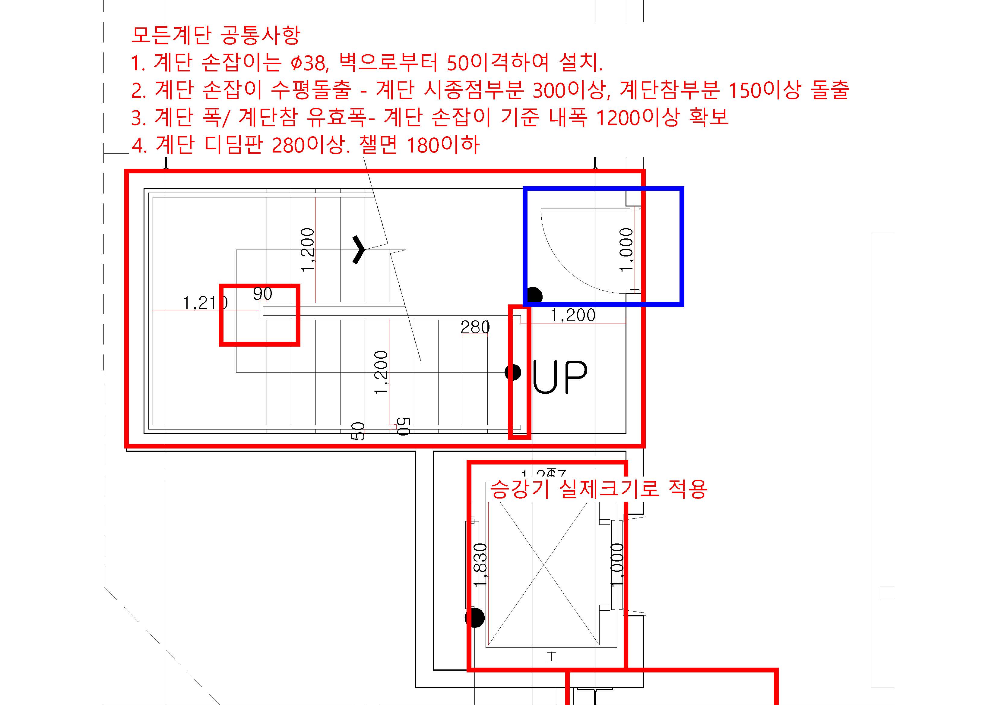 계단은 너무 타이트하게 계획 시 치수가 확보되지 않을 수 있기에 여유공간을 두고 계획해주시는 것이 좋습니다.