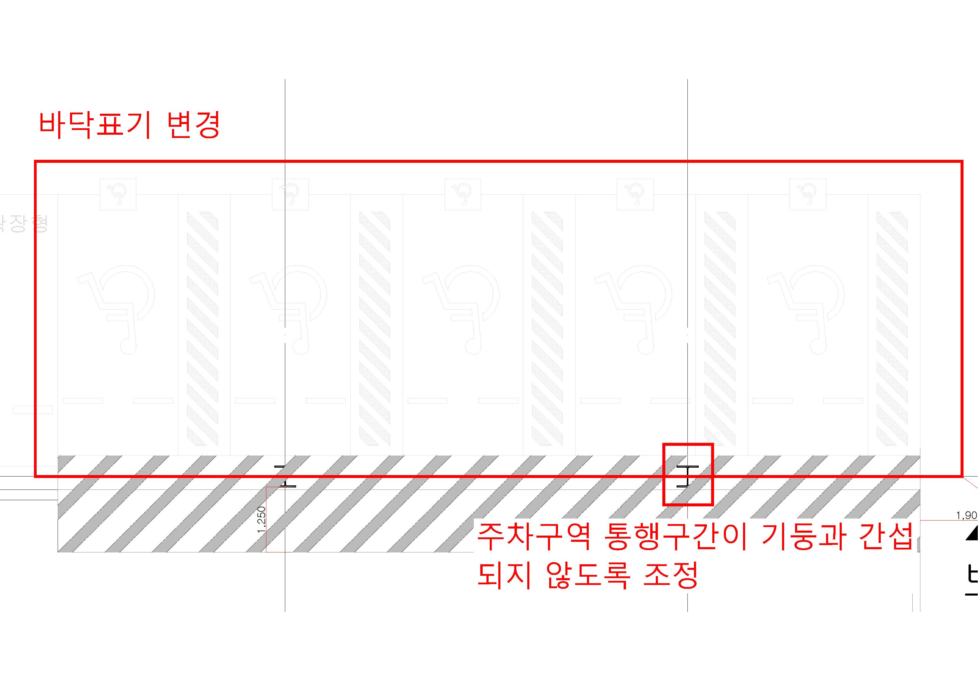 H빔 기둥과 장애인주차구역 휠체어 활동공간(측면 빗금 부분)과 간섭되면 안 됩니다.