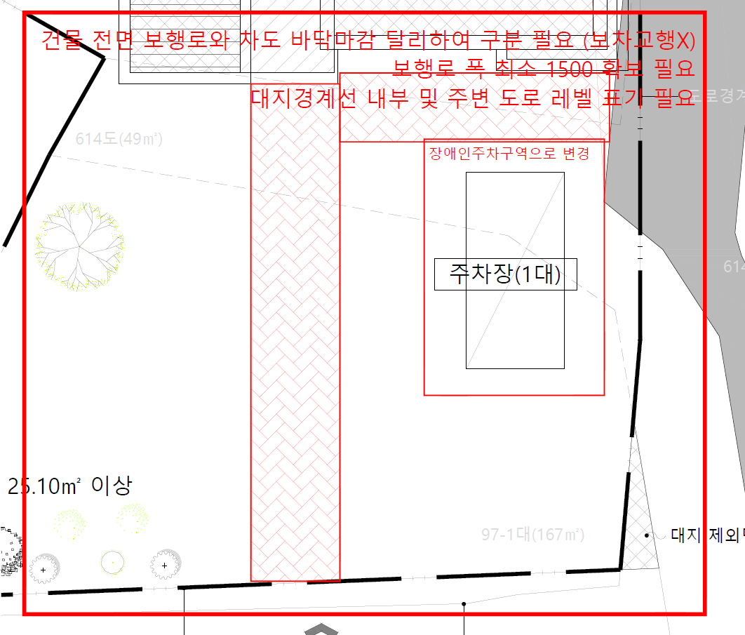 대지 경계선부터 건물까지의 접근로가 없어서 계획해 드렸습니다.