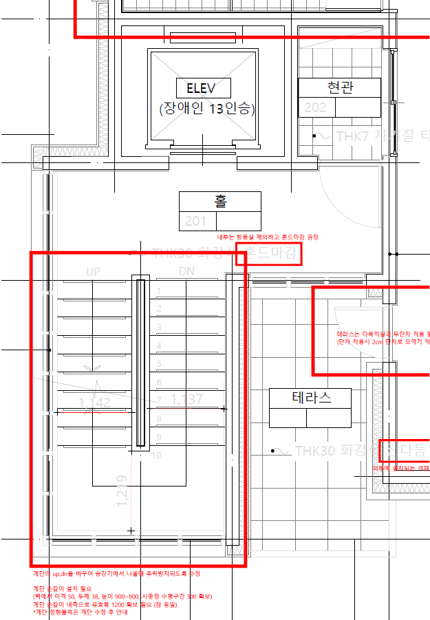 승강기에서 휠체어가 내리고 타려면 회전을 해야하는데 회전공간은 확보가 되어있지만 하단측에 계단 DN 부분이 계획되어 있습니다.