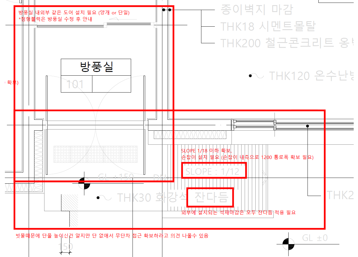 일단 현재 이 건물은 제주도에 설치되는 건물이 아니기에 건물 레벨을 낮추어 단차 없이 계획하라는 의견이 나올수 있고