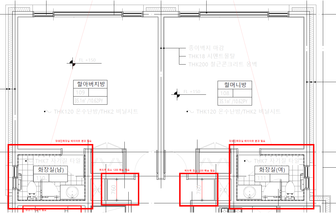 할머니방, 할아버지방의 도어 손잡이 측면 활동공간 600이 현재 미확보 되어 있는데요.