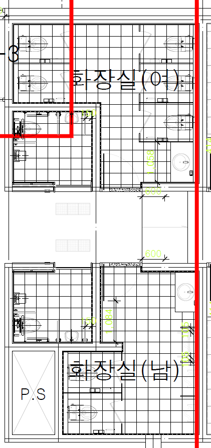 일반화장실 먼저 보면 도어 손잡이 측면 600 활동공간이 복도 경사로와 간섭되어 있습니다.