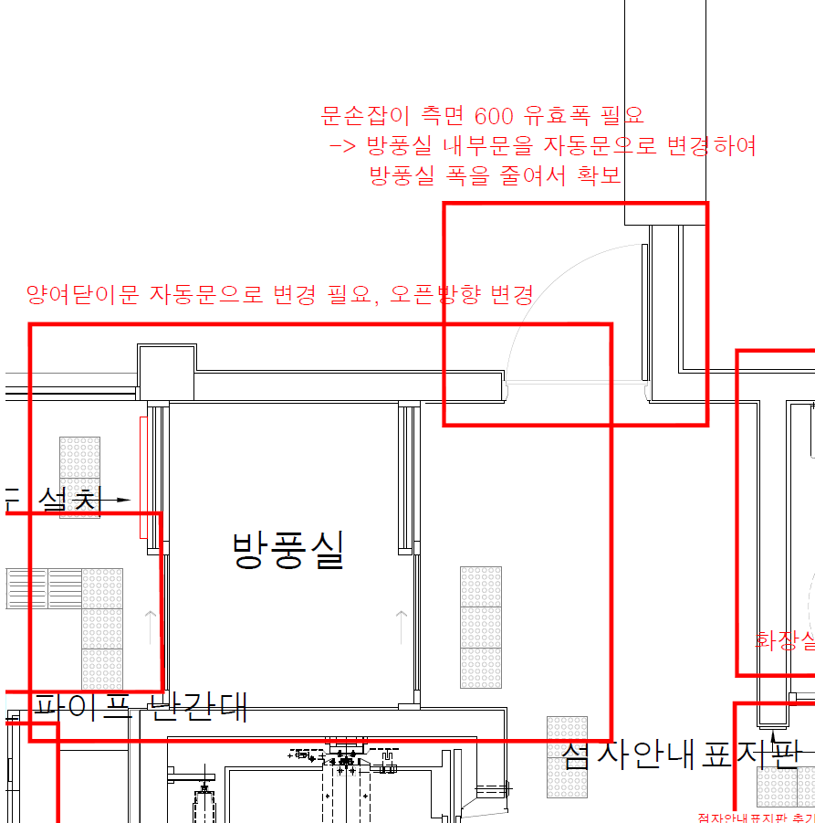 5. 방풍실 위쪽 실의 도어 손잡이 측면 600 활동공간이 미확보 되어 있다.