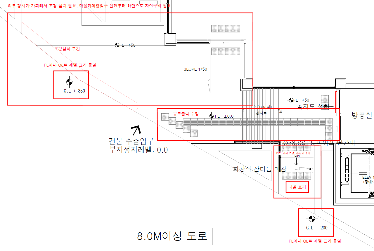 대지 자체가 경사진 대지로 외부 8m 도로도 평균 1/20기울기가 나는 상황이었습니다.