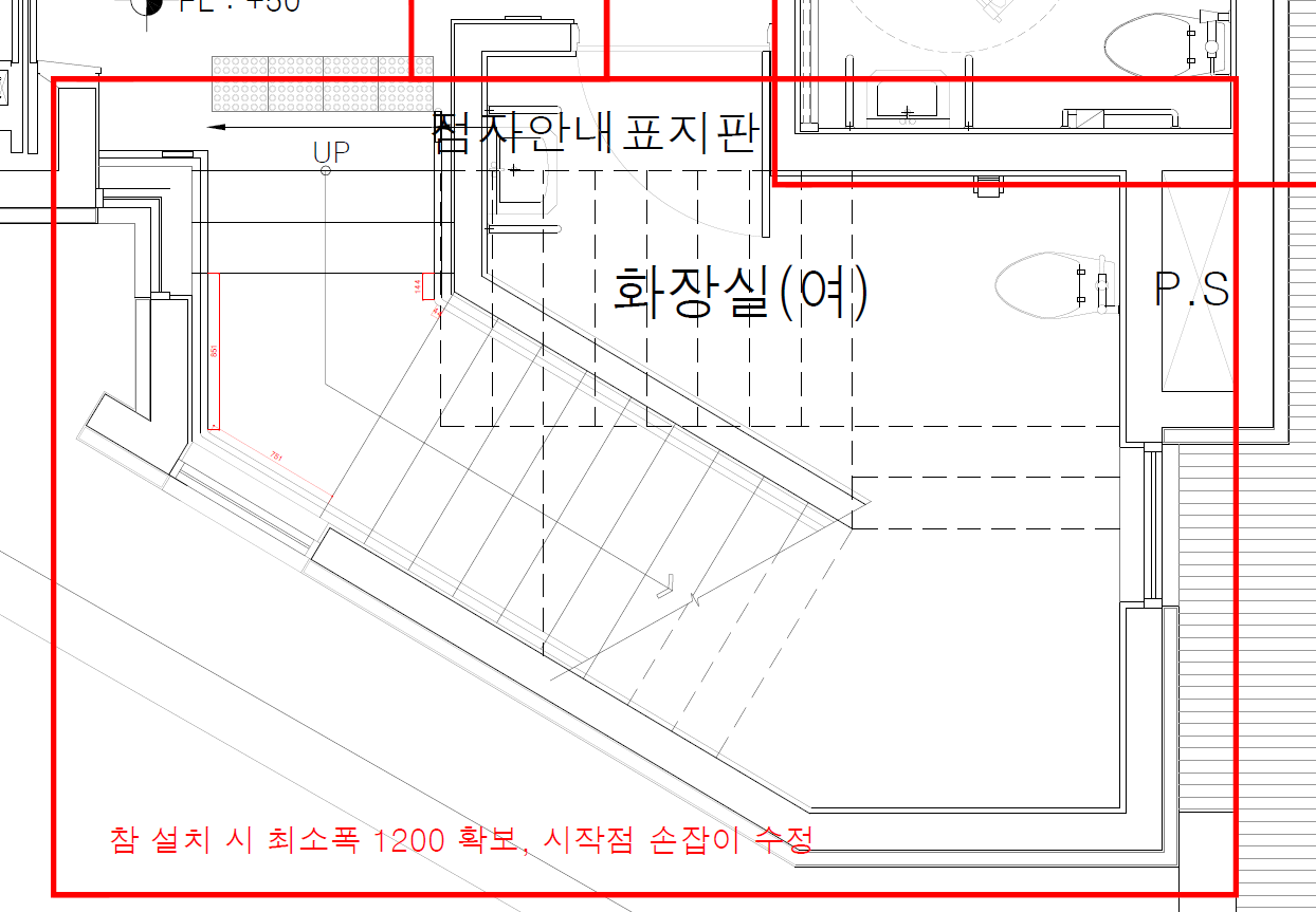 위 사진의 계단은 중간의 참 폭이 1200이 확보되지 않아 표기해드렸습니다.